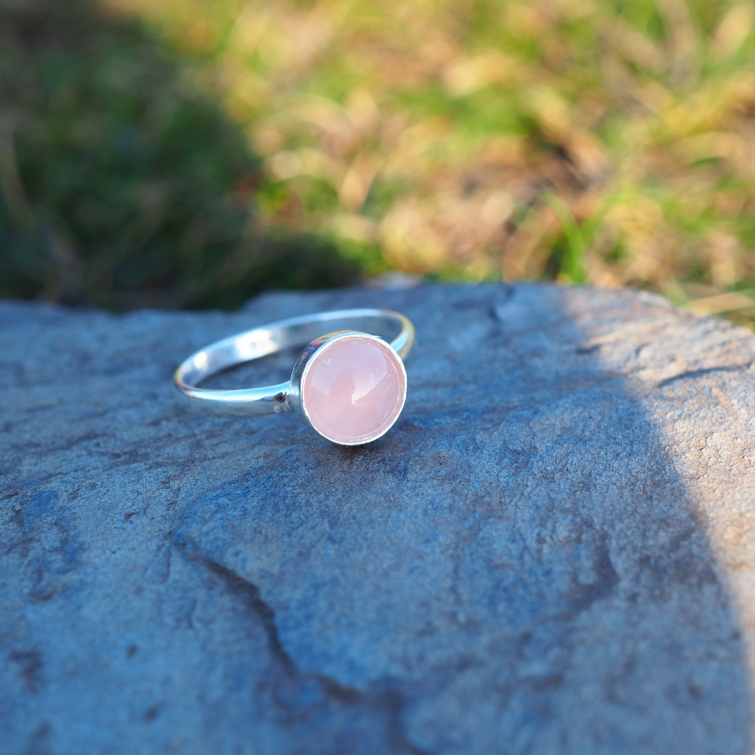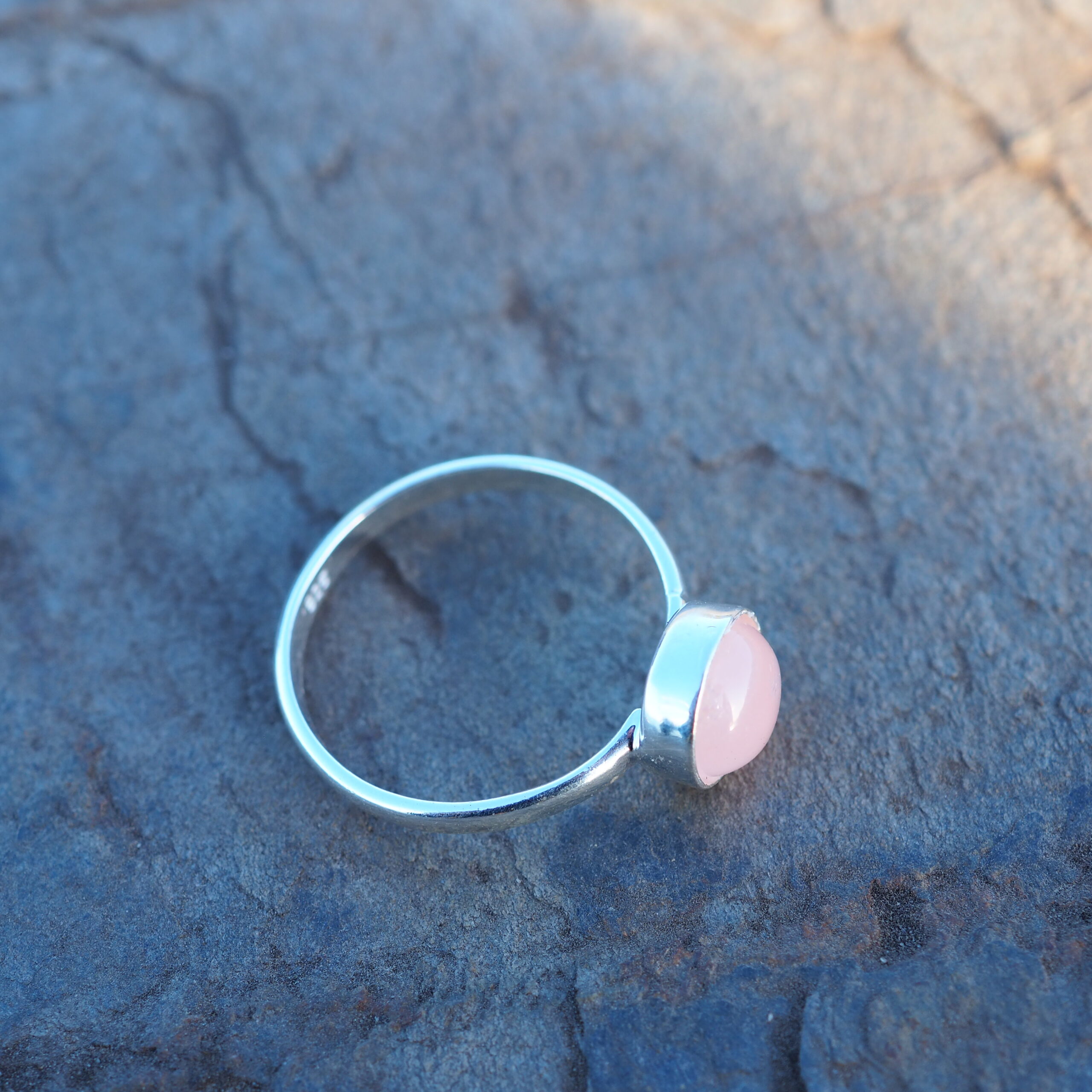 Bague classique à cabochon rose pâle, anneau plat en argent 925, style épuré. Bijou léger à cabochon arrondi de quartz rose. Pierre naturelle et argent.