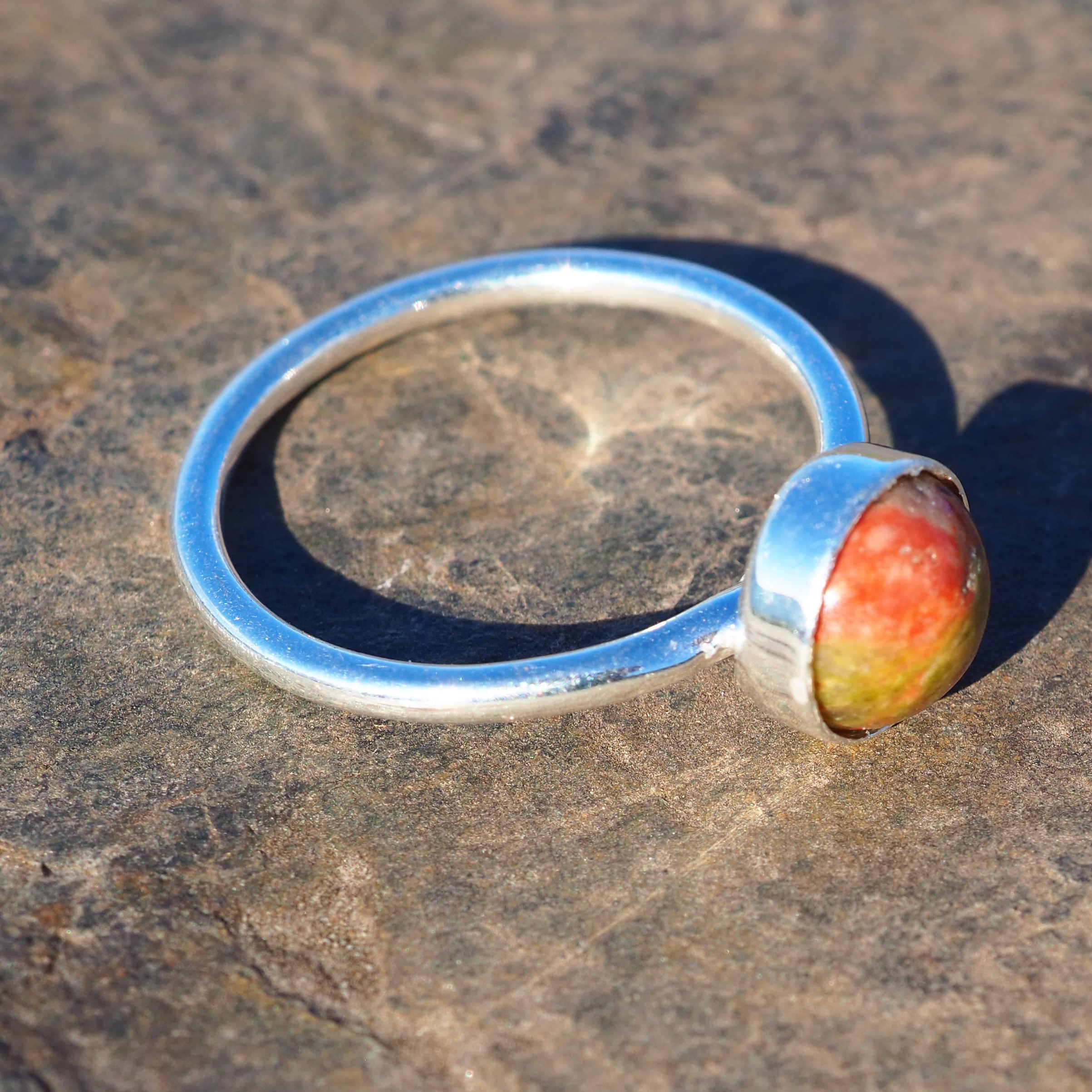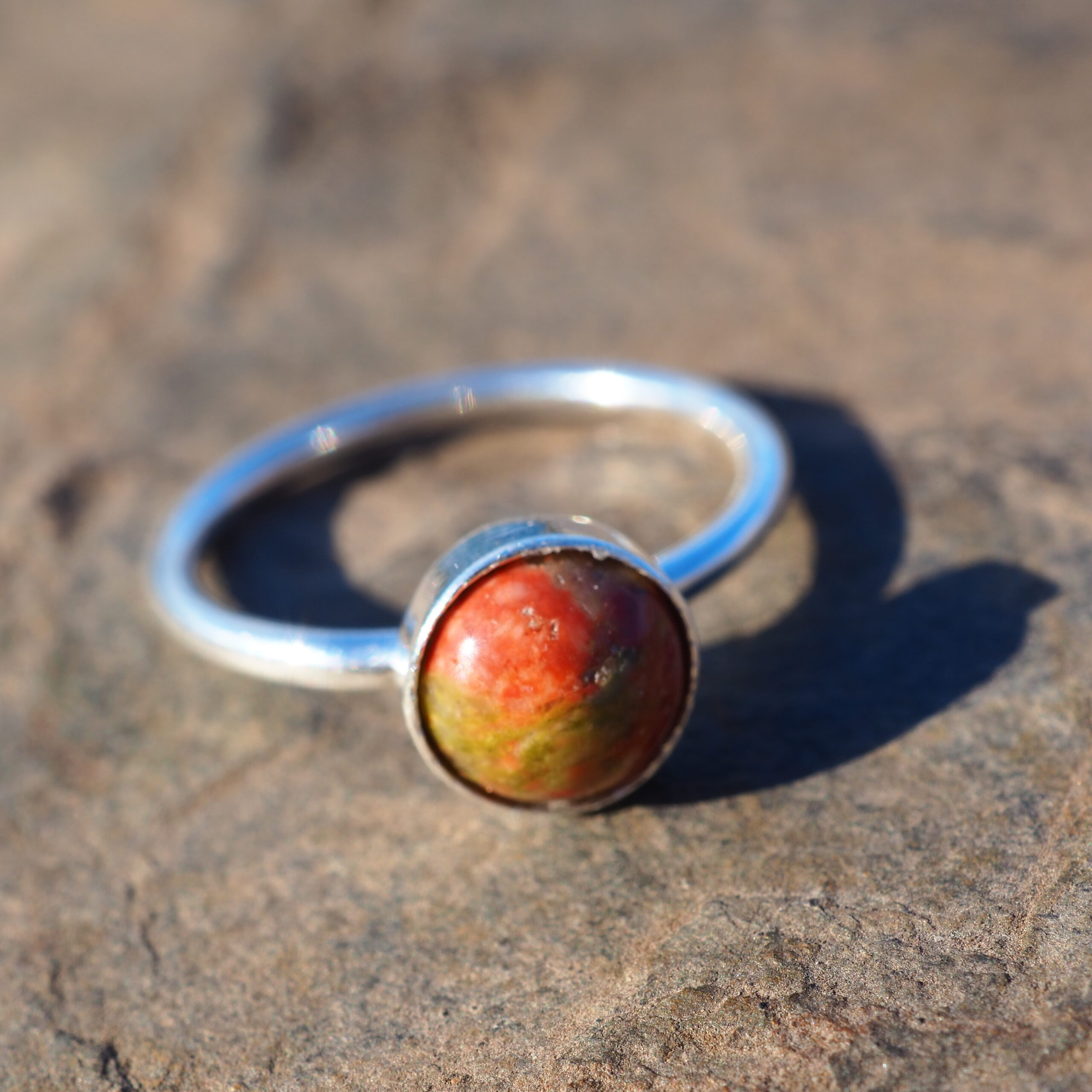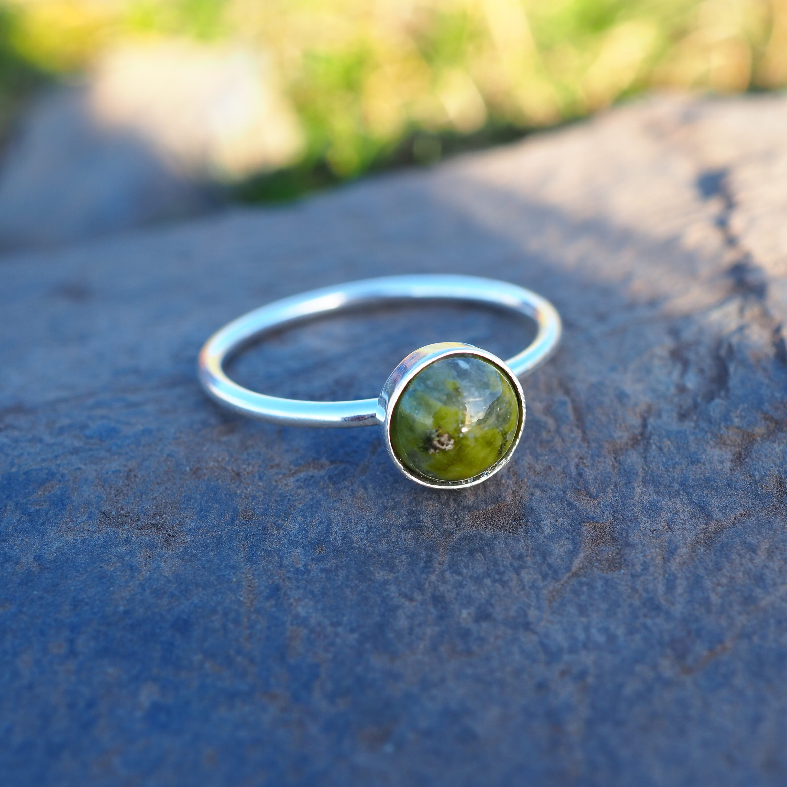 Bague minimaliste à cabochon de pierre naturelle arrondie. Unakite verte moirée de rose. Couleur très naturelle. Anneau rond en argent 925.