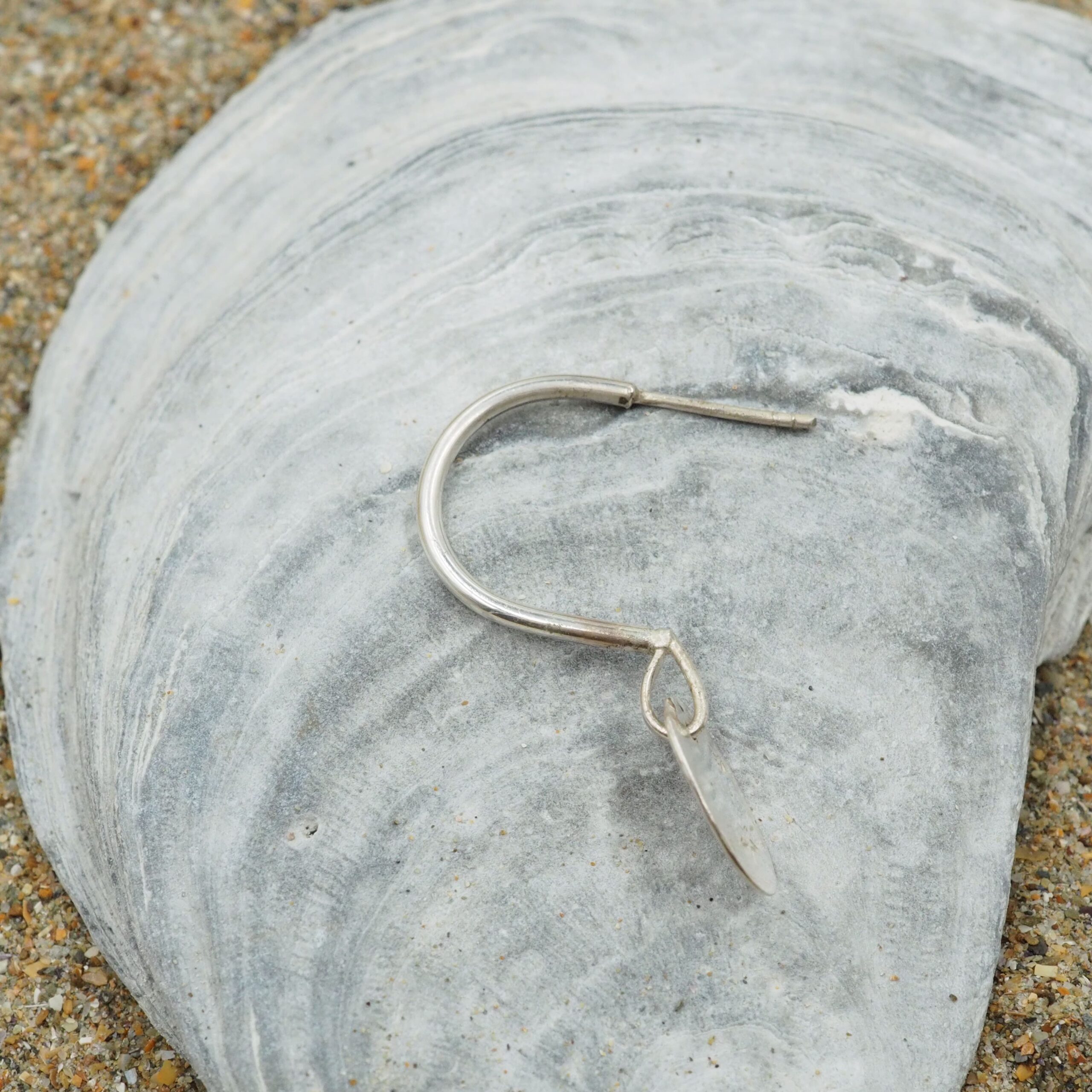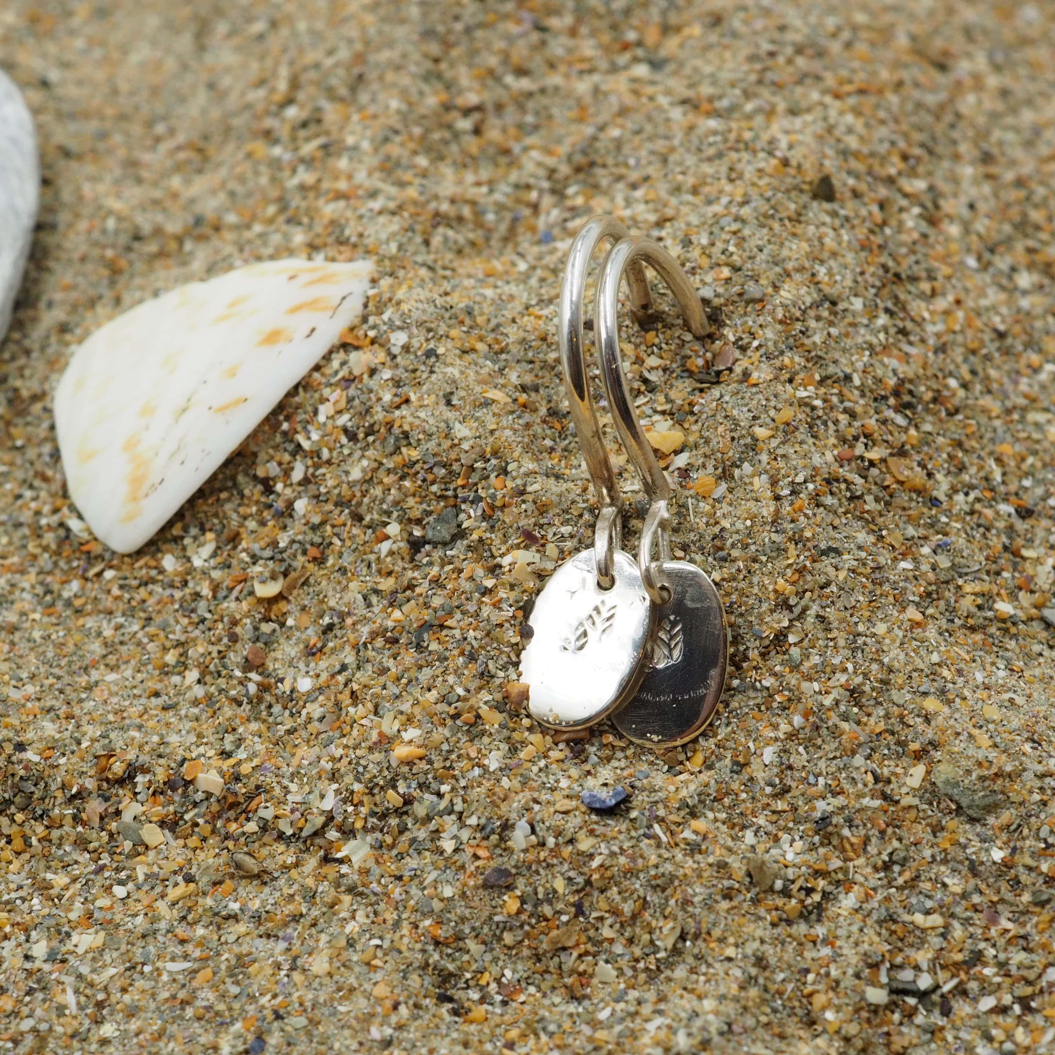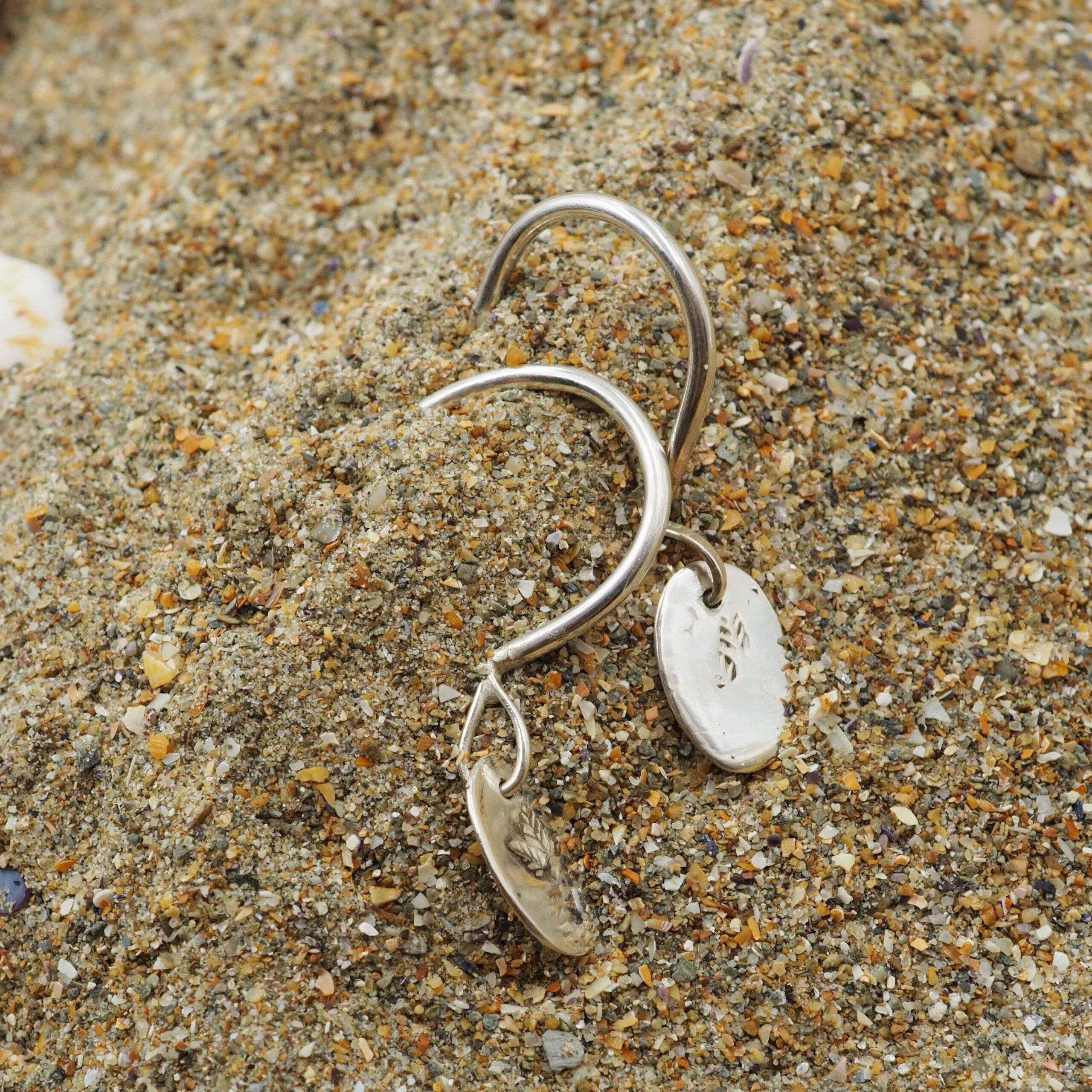 Boucles d’oreilles en argent massif façonnées à la main. Demies créoles avec petites breloques poinçonnées d’un motif végétal.
