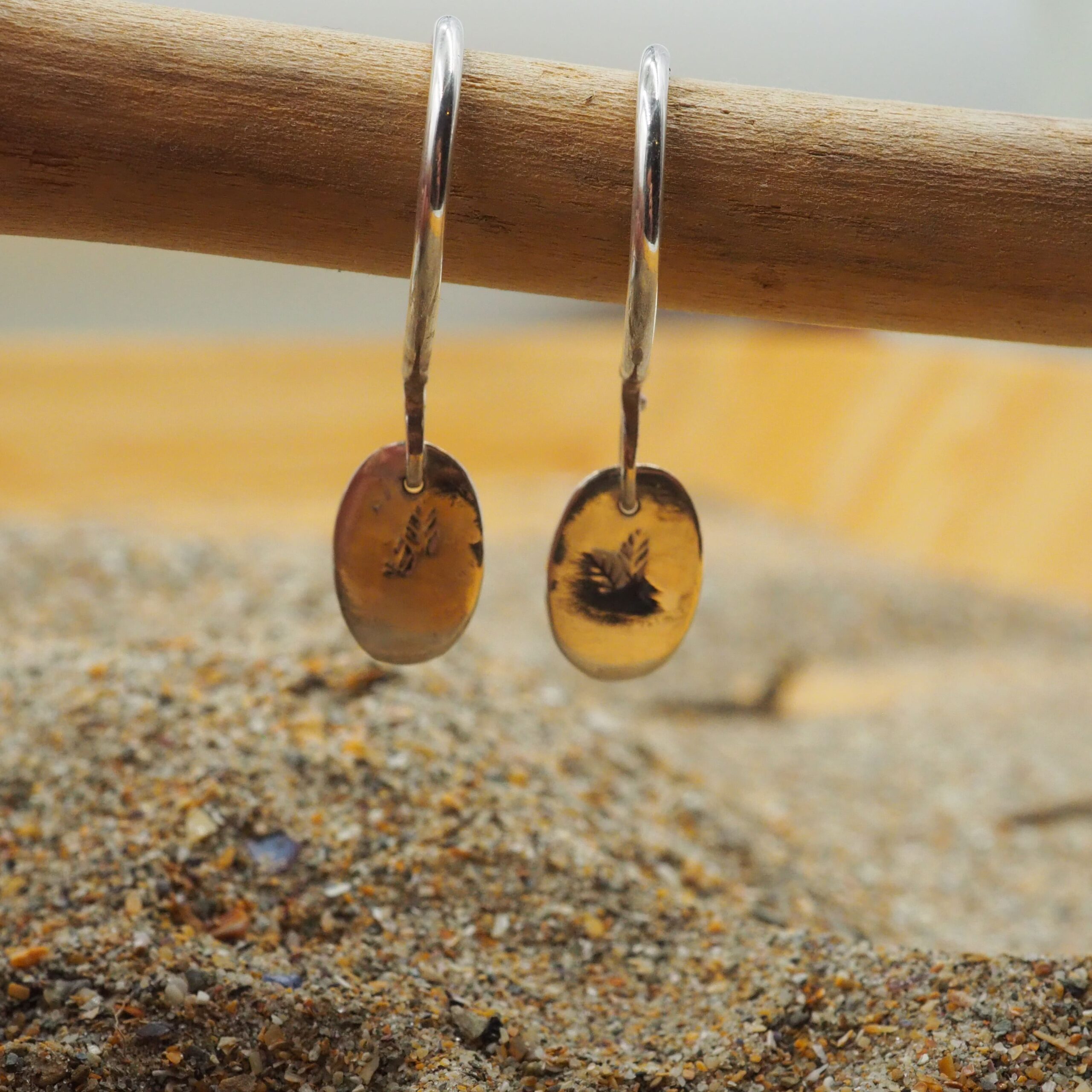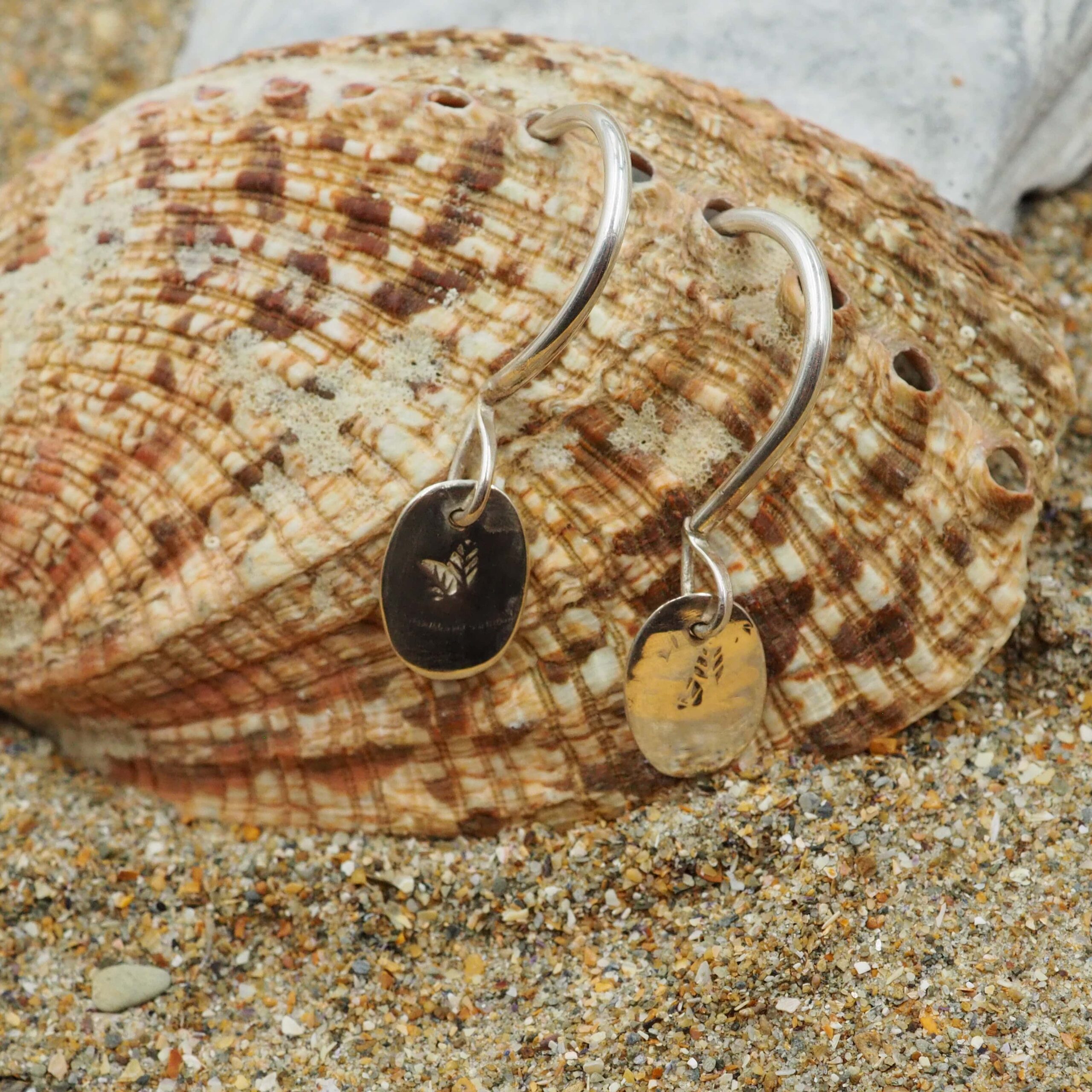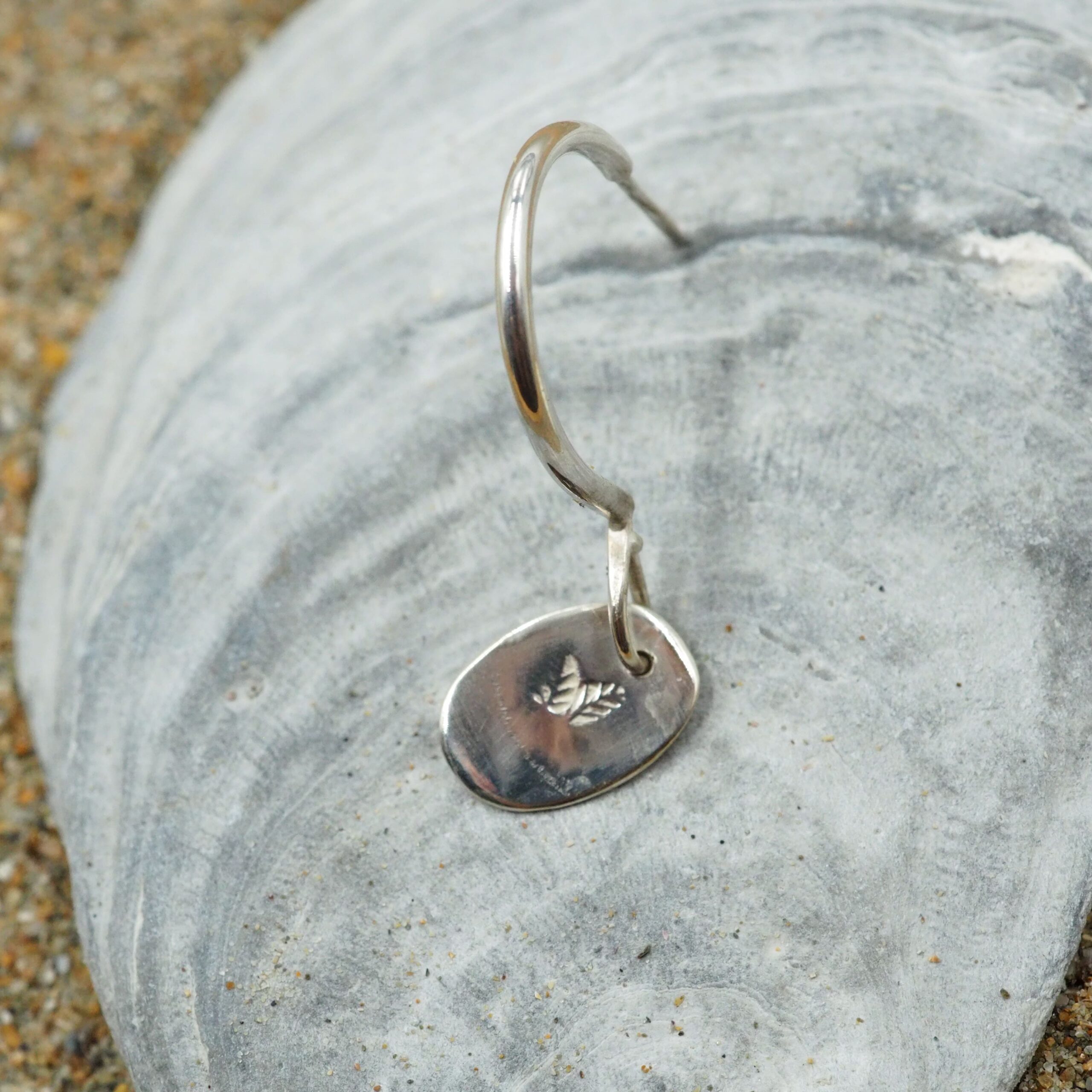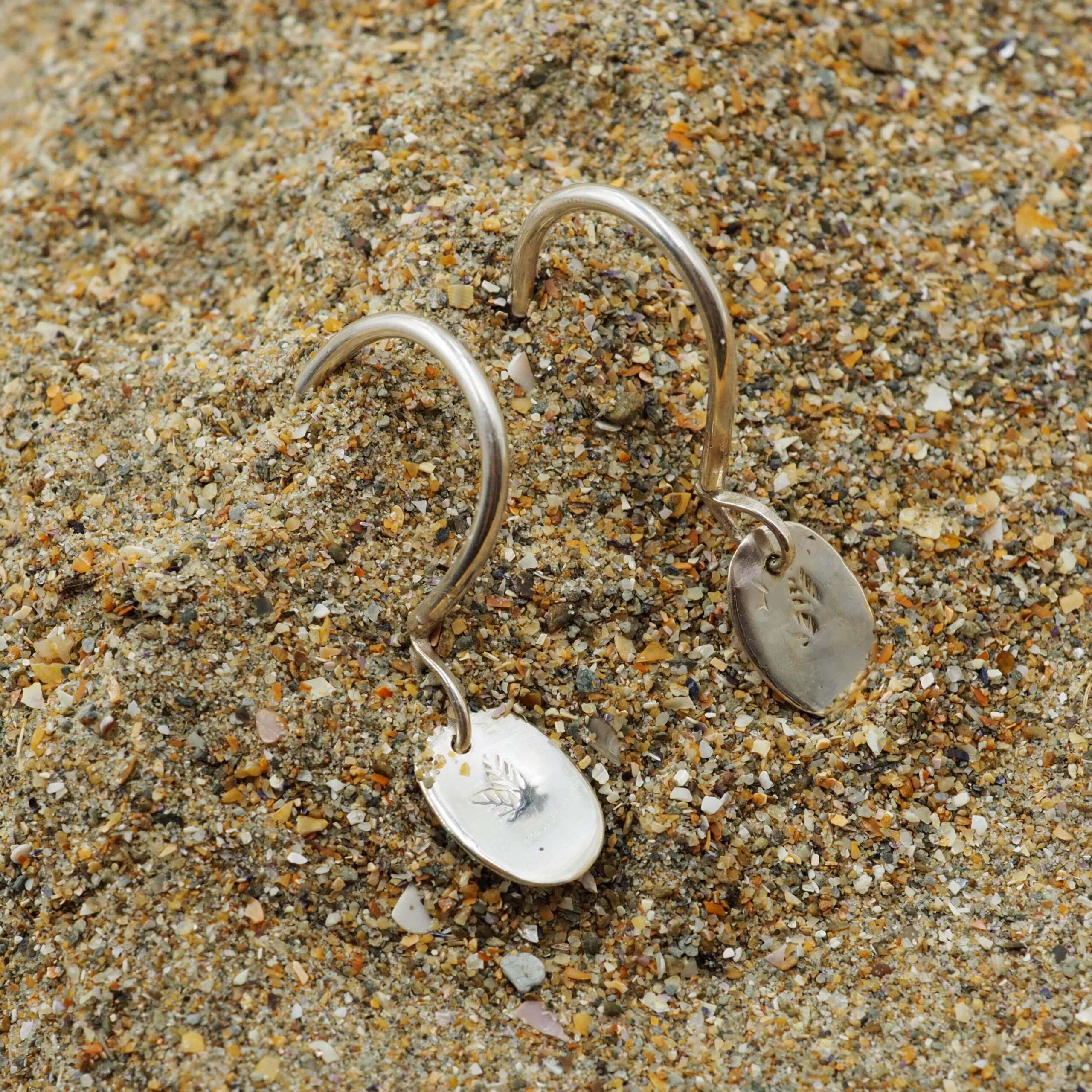 Boucles d’oreilles en argent massif façonnées à la main. Demies créoles avec petites breloques poinçonnées d’un motif végétal.