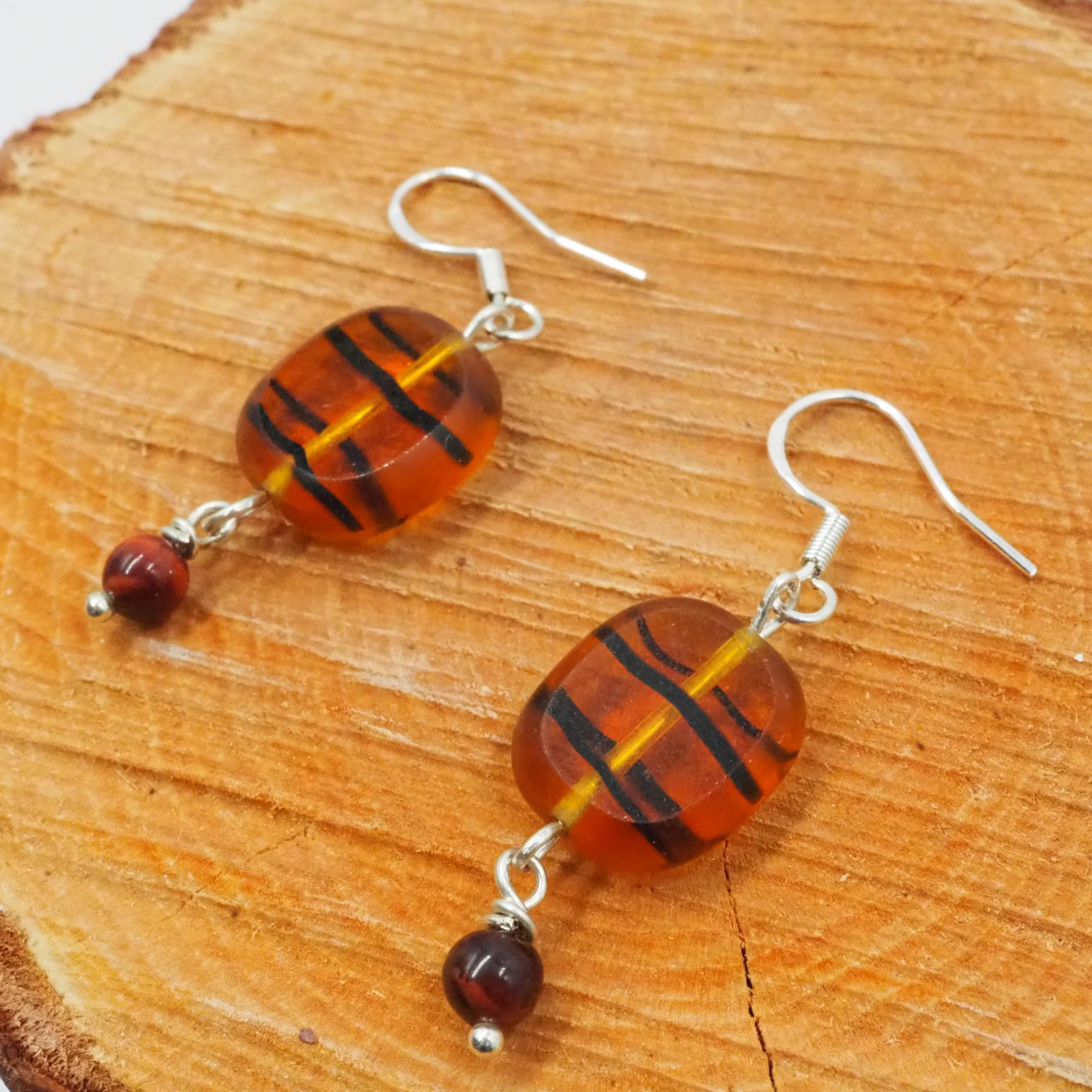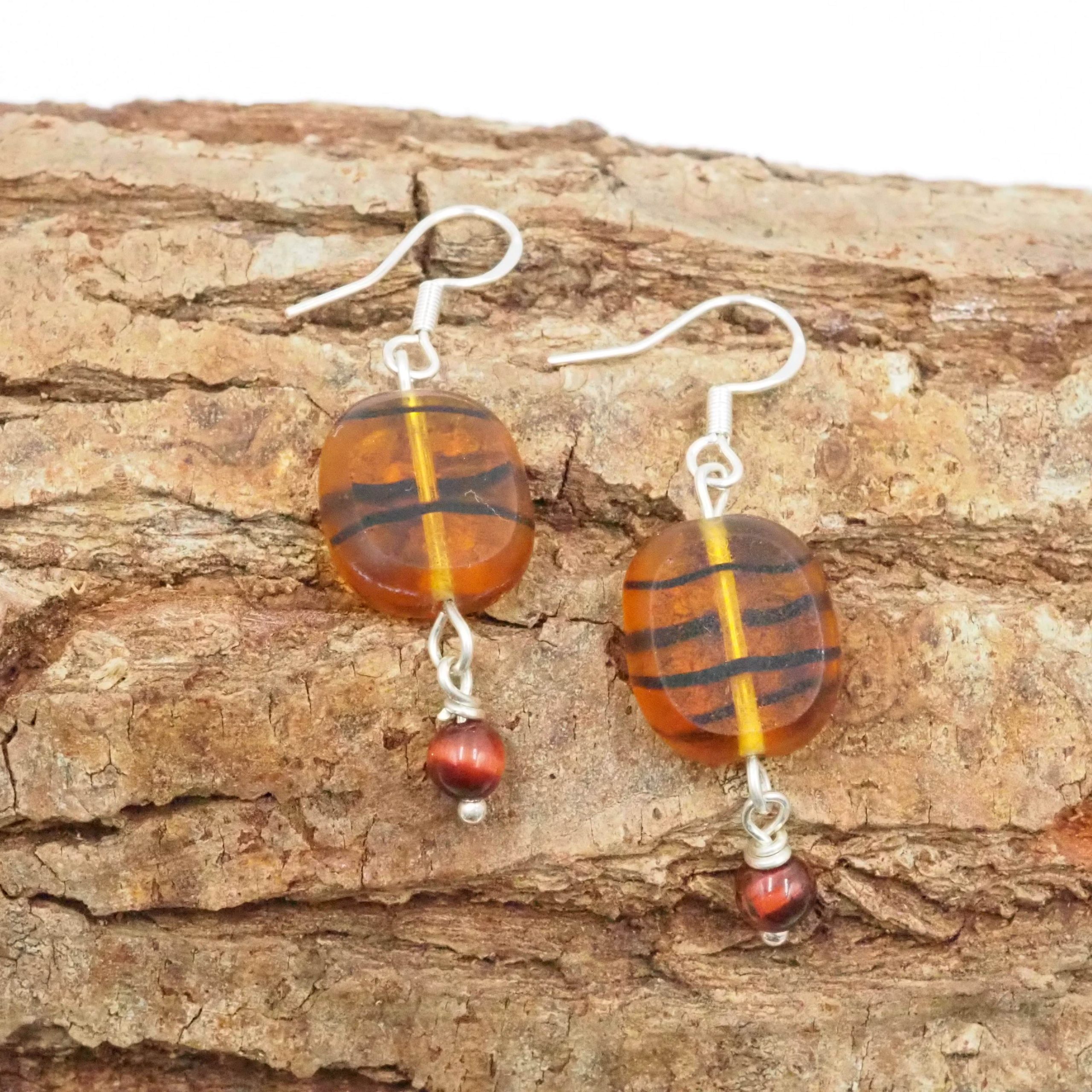 Boucles d’oreilles ambrées au style ‘wild’ et élégante ! Association de l’œil de taureau et de verre ornementé de zébrures.