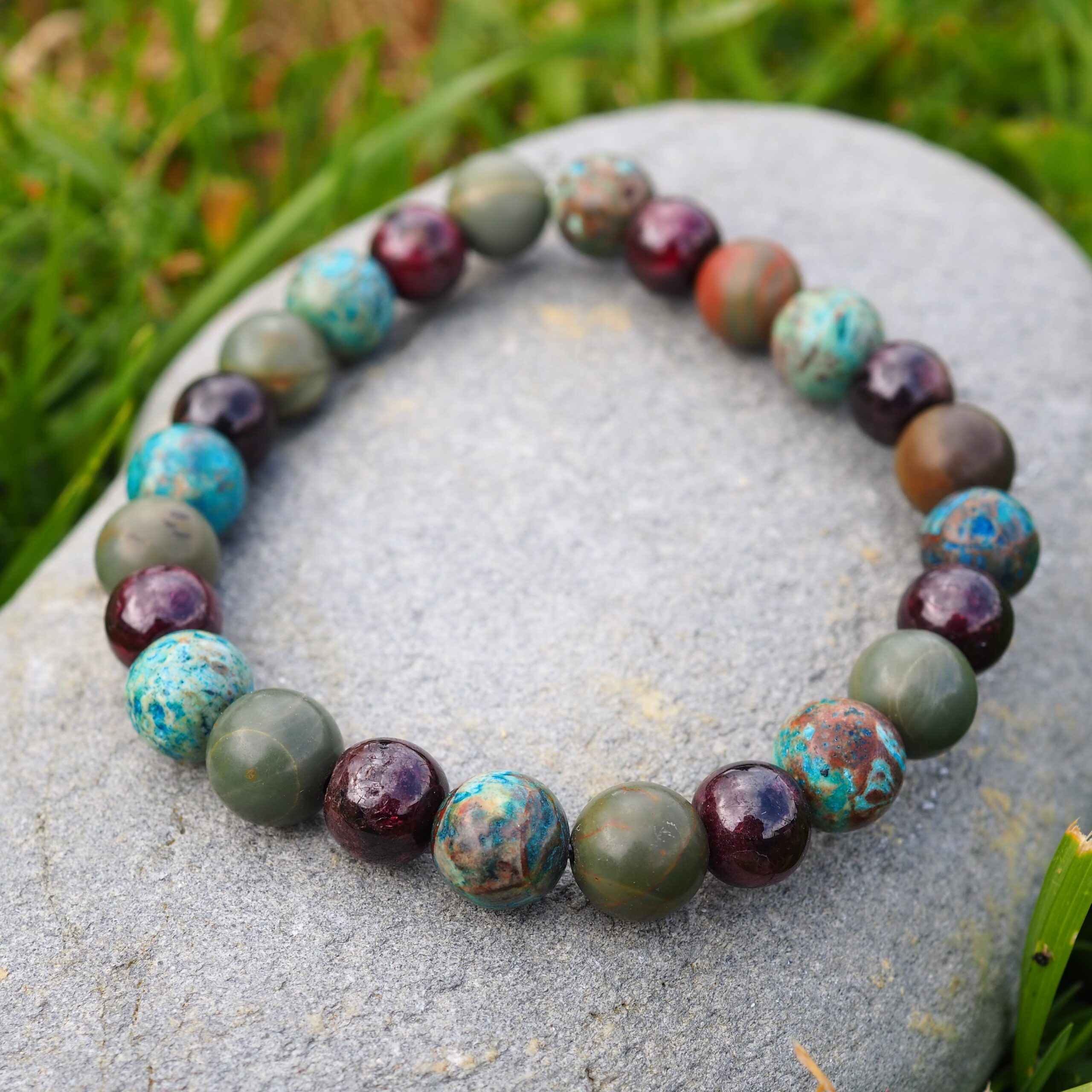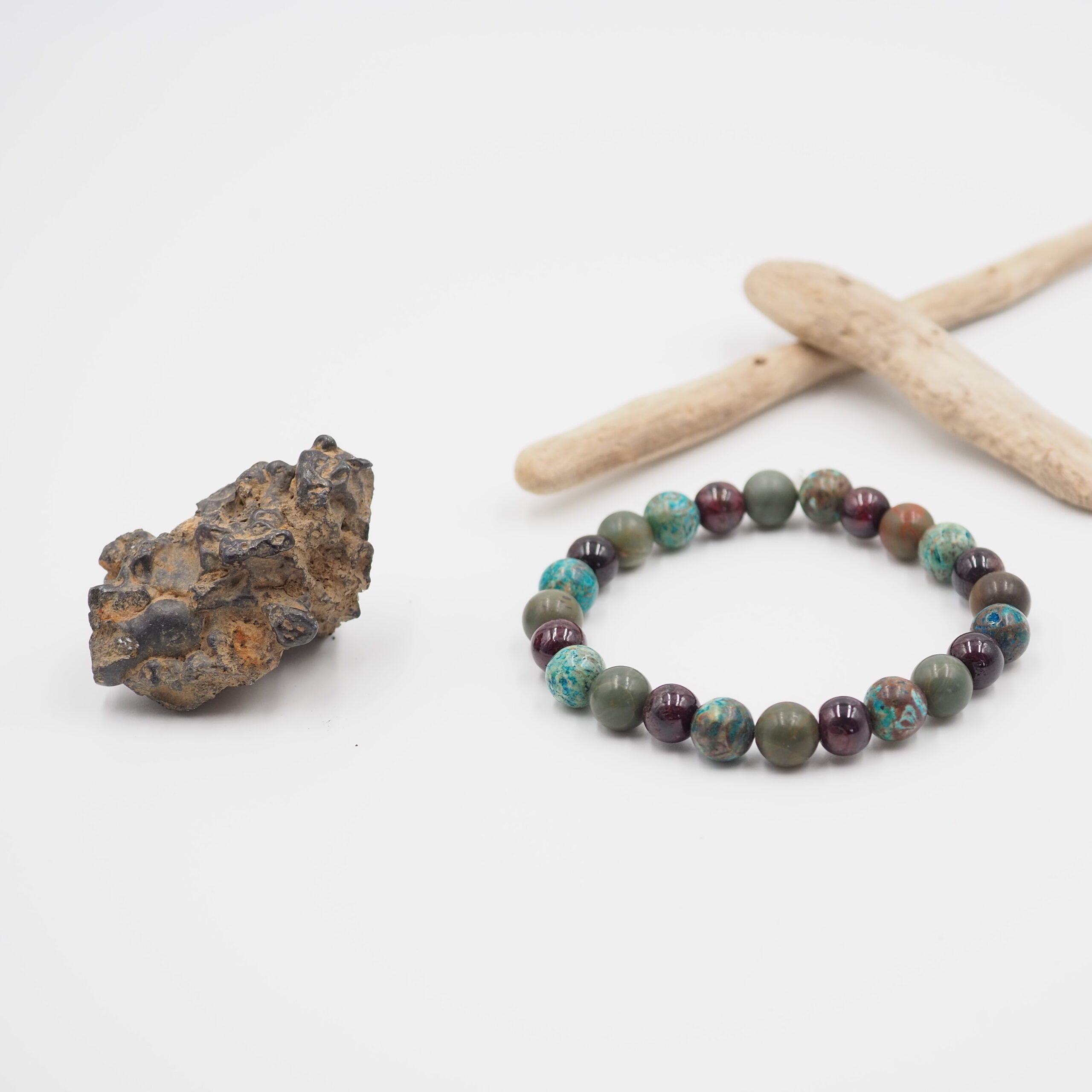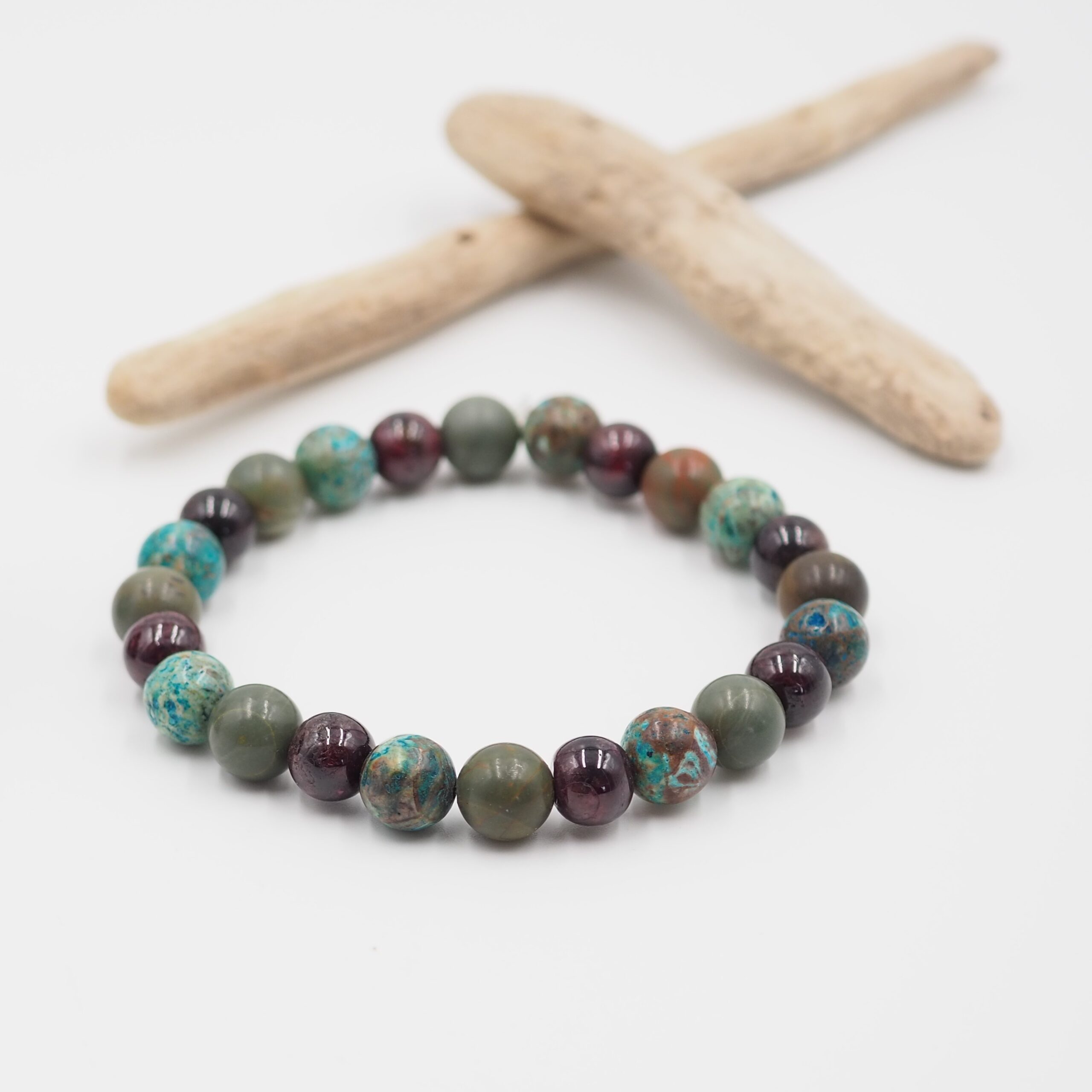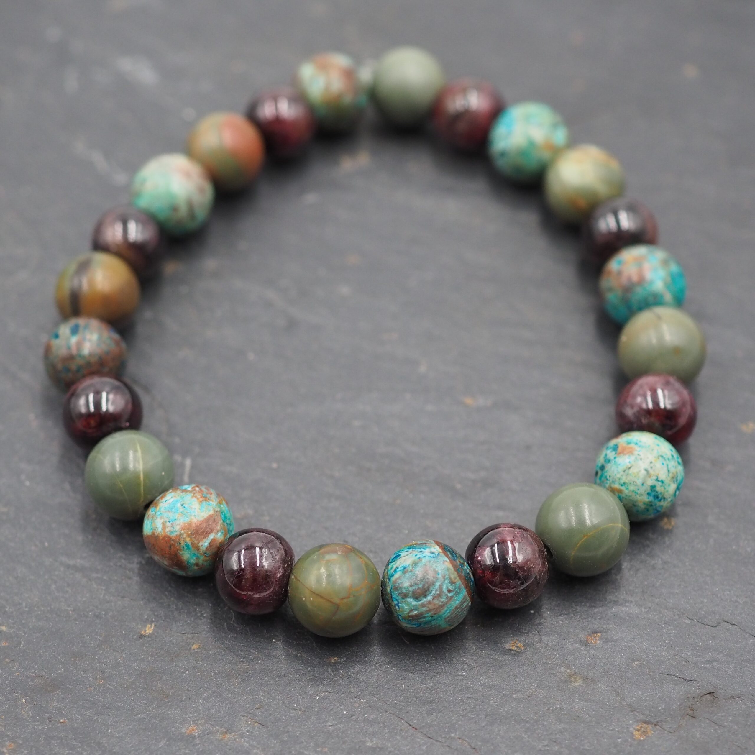 Bracelet aux teintes naturelles, du vert, du grenat et des nuances de turquoises sur un fil élastique, bijou masculin ou mixte !